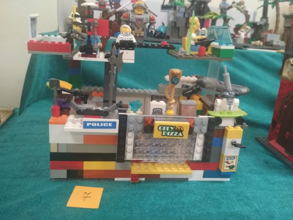 Wystawa prac lego w łączniku szkolnym