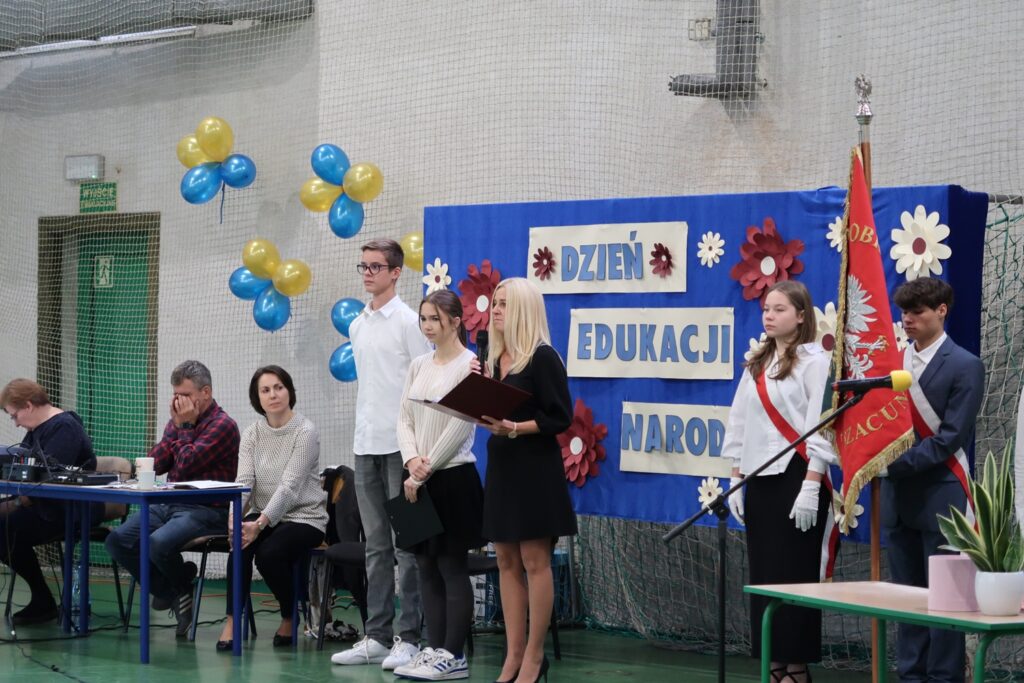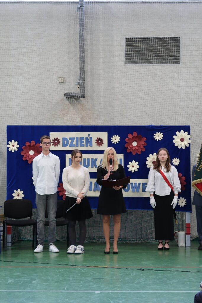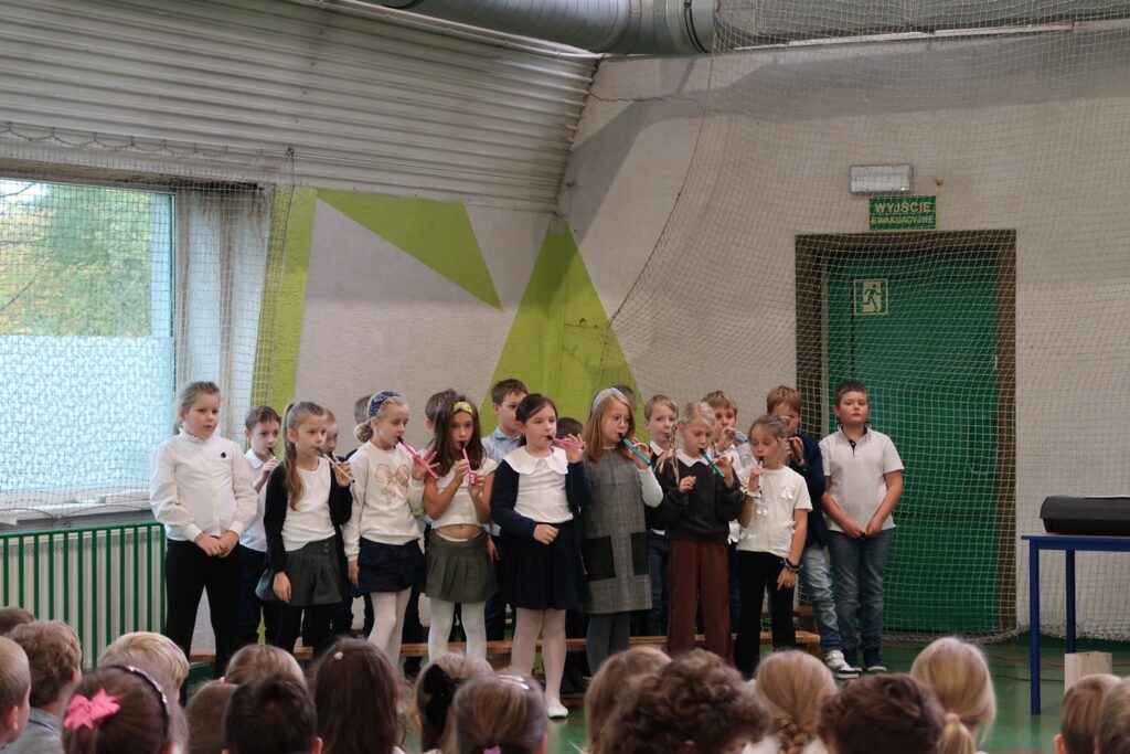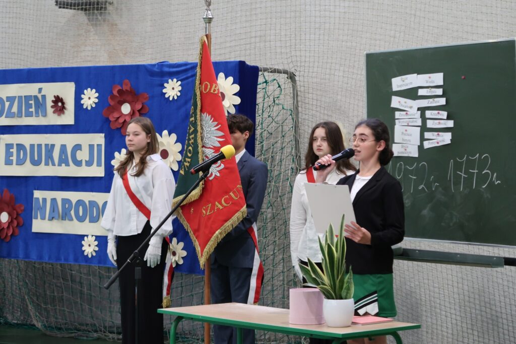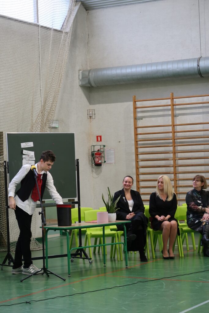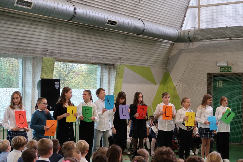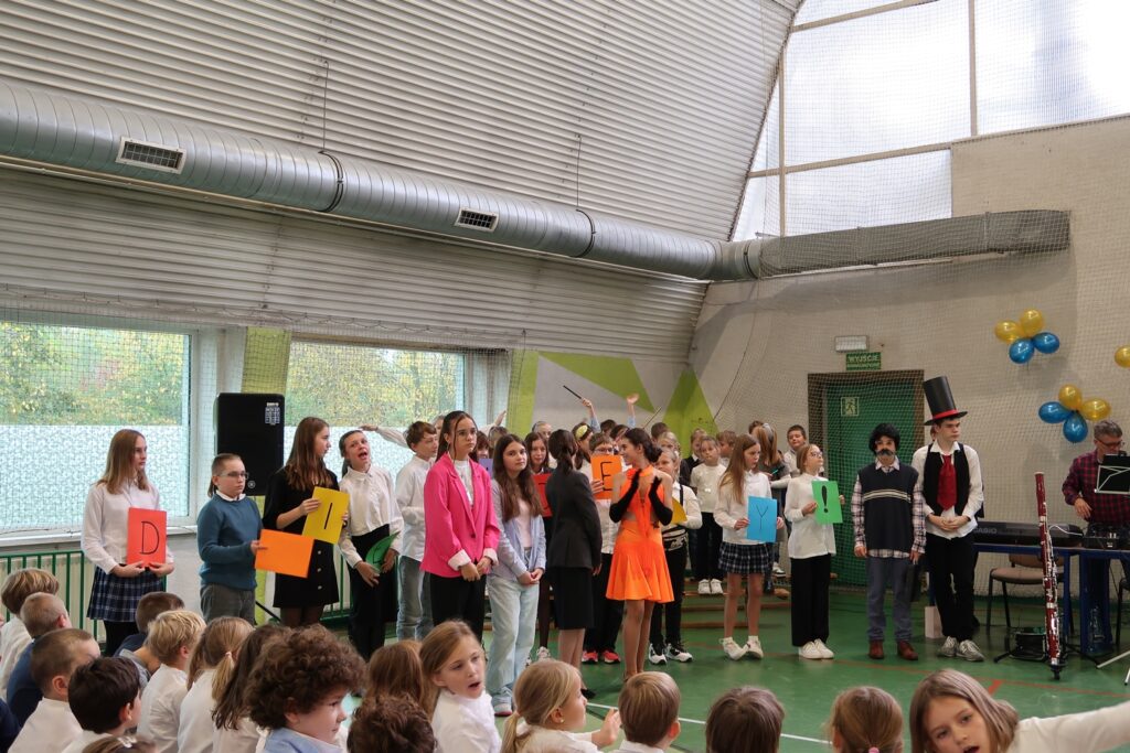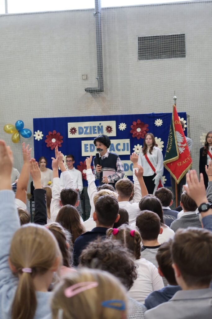 Ważnym momentem tego święta było uczestnictwo w uroczystej akademii, którą przygotowali uczniowie klasy 6a oraz 8c. Przeprowadzili dla wszystkich niecodzienne lekcje, w ciekawy sposób wzbogacając uczniowską wiedzę o historii Dnia Edukacji Narodowej oraz o tym, kiedy święto nauczycieli jest obchodzone w innych krajach. Pojawił się też nauczyciel-czarodziej, a z jego kapelusza – cechy idealnego nauczyciela. Nie obyło się bez sprawdzenia wiedzy uczniów, lecz tym razem bez obawy o słaby stopień! Tylko poprawnie udzielona odpowiedź nagradzana była cukierkiem.