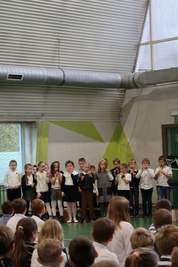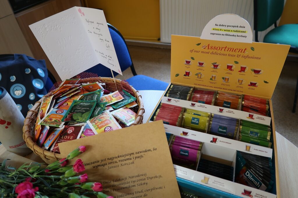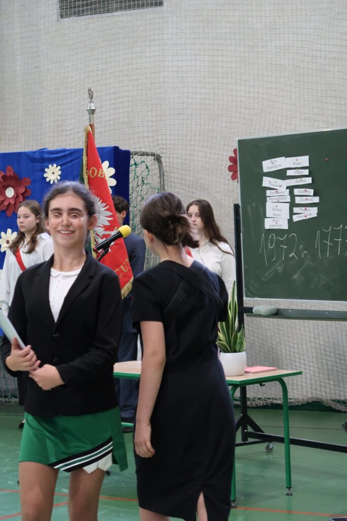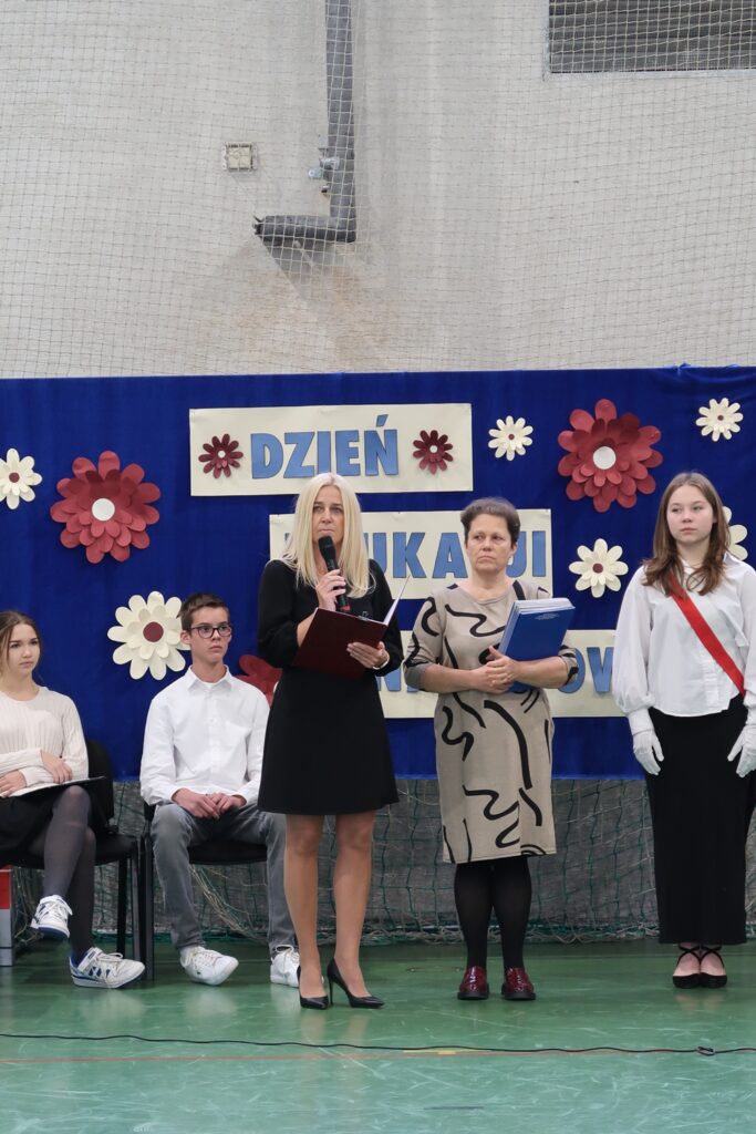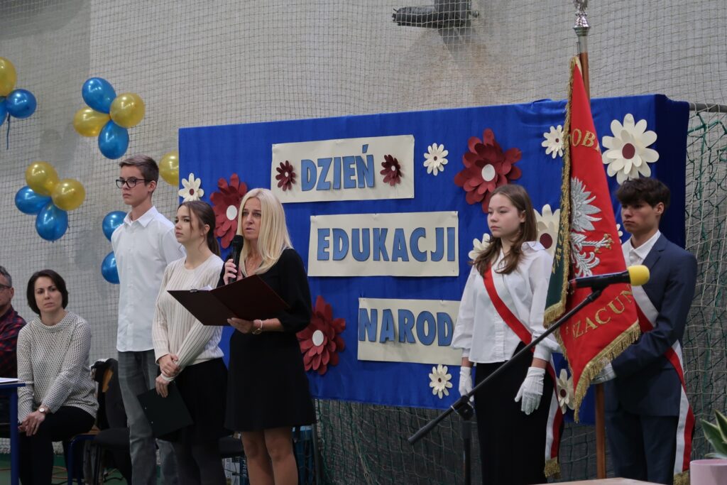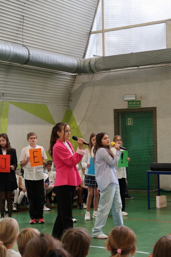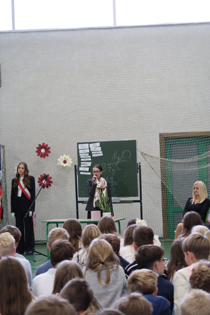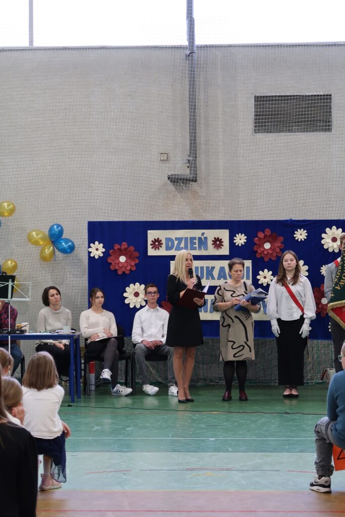 Ważnym momentem tego święta było uczestnictwo w uroczystej akademii, którą przygotowali uczniowie klasy 6a oraz 8c. Przeprowadzili dla wszystkich niecodzienne lekcje, w ciekawy sposób wzbogacając uczniowską wiedzę o historii Dnia Edukacji Narodowej oraz o tym, kiedy święto nauczycieli jest obchodzone w innych krajach. Pojawił się też nauczyciel-czarodziej, a z jego kapelusza – cechy idealnego nauczyciela. Nie obyło się bez sprawdzenia wiedzy uczniów, lecz tym razem bez obawy o słaby stopień! Tylko poprawnie udzielona odpowiedź nagradzana była cukierkiem.