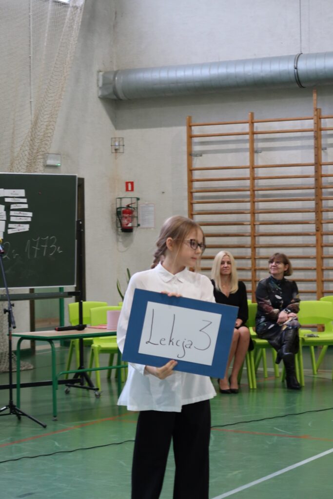 W przerwach między kolejnymi „lekcjami” wszystkich zgromadzonych widzów spotkała prawdziwa artystyczna uczta, bowiem nasi uczniowie prezentowali swoje rozliczne talenty. Klasa 2b pod przewodnictwem p. Małgorzaty Wolskiej zaśpiewała zgromadzonym nauczycielom oraz zagrała na flażoletach. Ponadto można było wysłuchać naszej uzdolnionej fagocistki – Anny Głowińskiej z klasy 6a, zapatrzeć się na Zofię Kowalewską z 6a w tańcu latino. Piosenkę Sylwii Grzeszczak zaśpiewały zaś Lena Rogalska z 7c i Marta Zielonka z 6b.