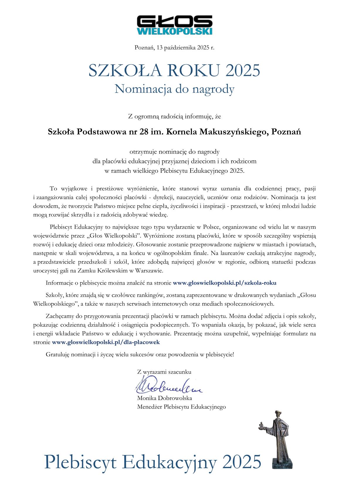 Nominacja szkoły oraz nauczycieli w tegorocznej edycji Plebiscytu Edukacyjnego 2025 Głosu Wielkopolskiego.