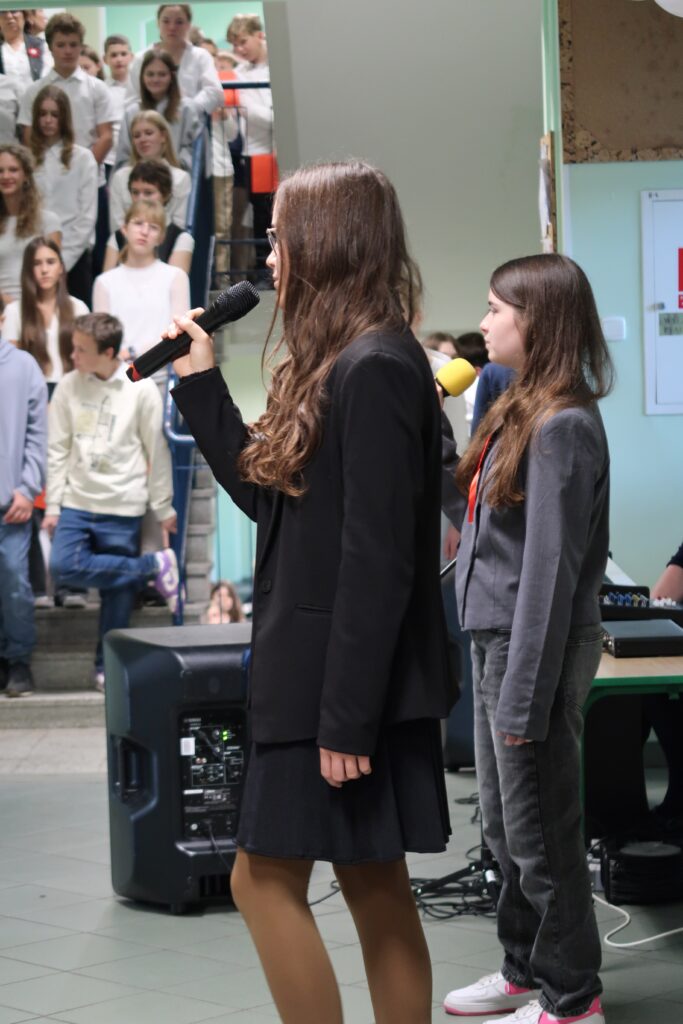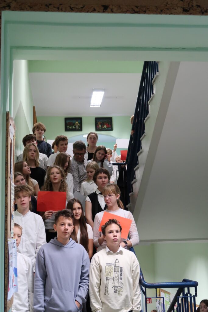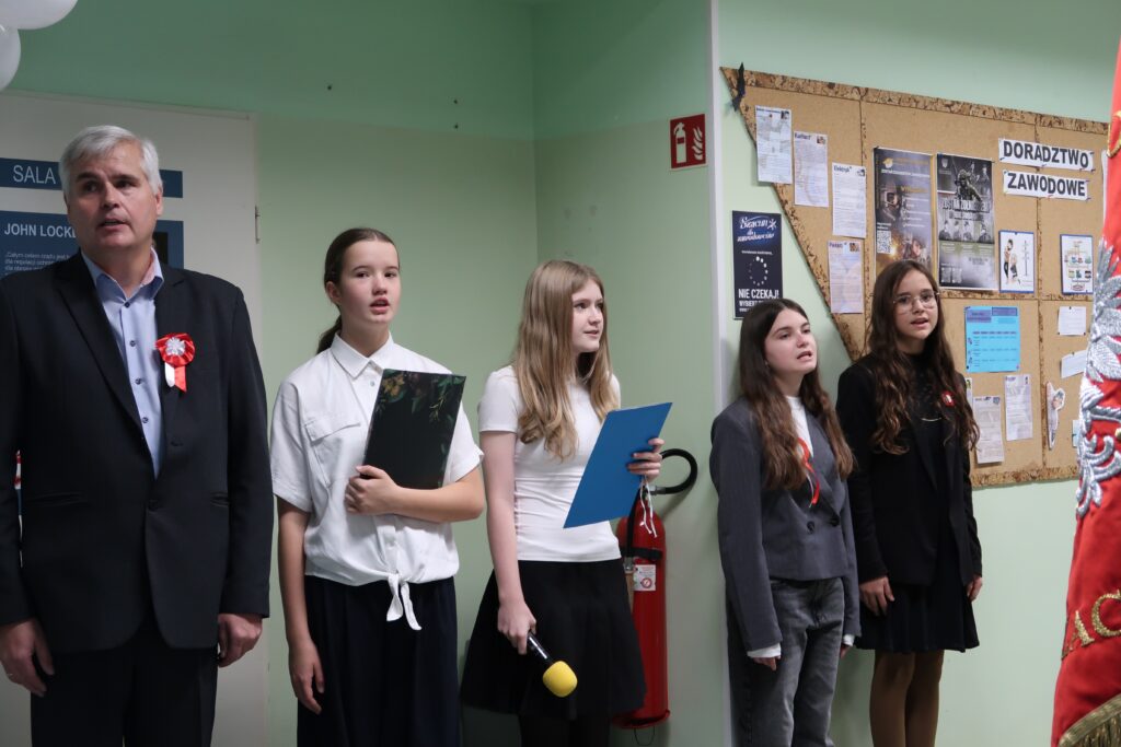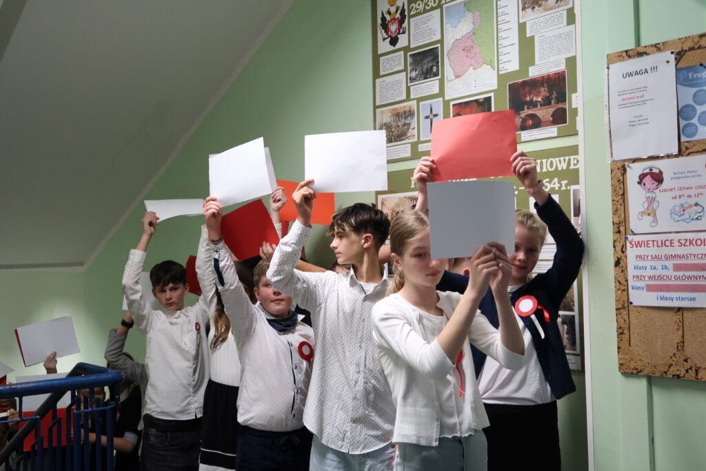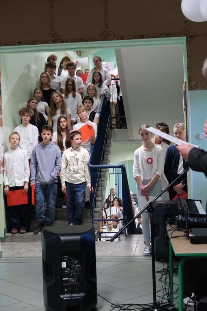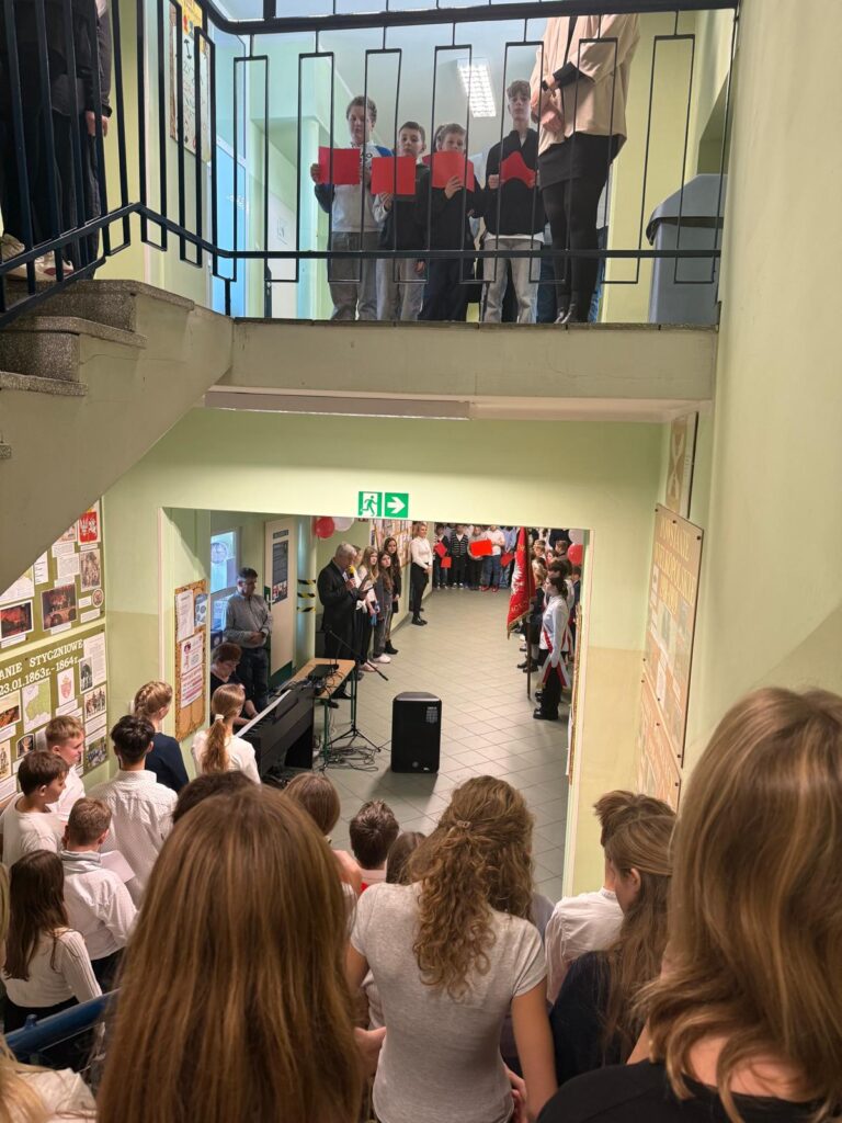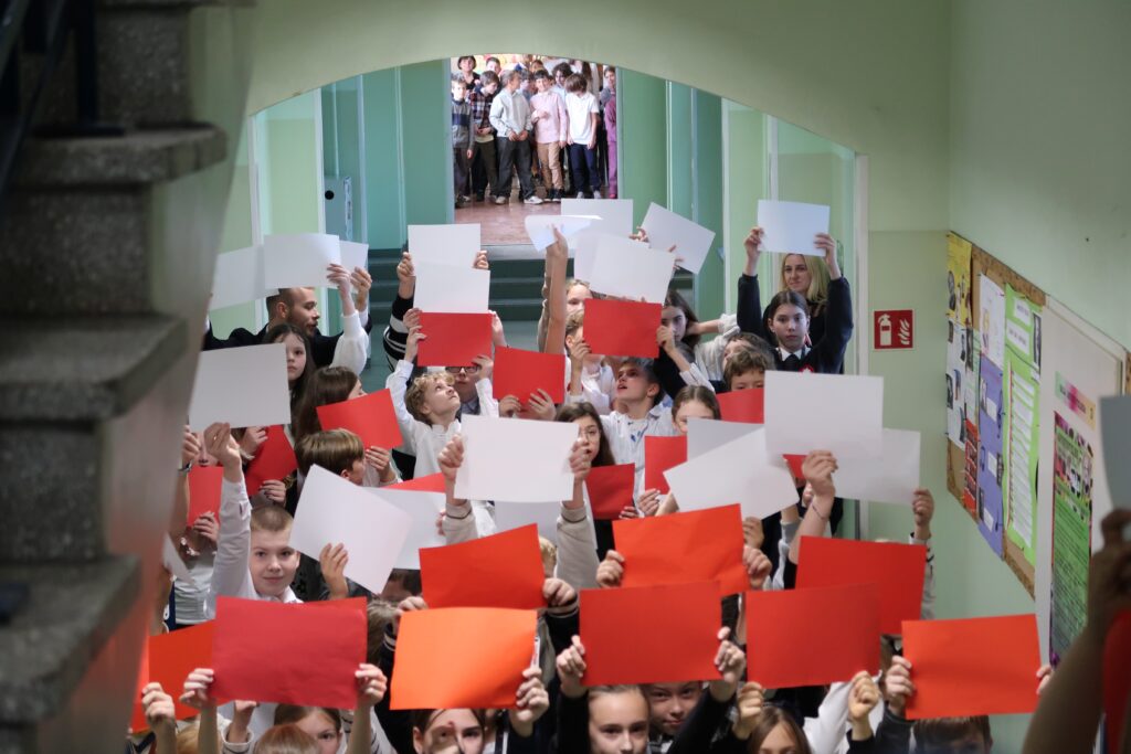 W ramach ogólnopolskiej akcji „Szkoła do Hymnu” społeczność Szkoły Podstawowej nr 28 w Poznaniu wzięła udział w wyjątkowym wydarzeniu upamiętniającym Narodowe Święto Niepodległości. 11 listopada o godzinie 11:11 cała szkoła uroczyście odśpiewała cztery zwrotki „Mazurka Dąbrowskiego”, dając wyraz pamięci o historii i wdzięczności wobec tych, którzy przyczynili się do odzyskania przez Polskę niepodległości. Po hymnie nauczyciel historii skierował do uczniów okolicznościowe przemówienie, w którym podkreślił znaczenie wolności oraz odpowiedzialności za jej pielęgnowanie. Następnie Marta i Lena zaprezentowały poruszające wykonanie utworu „Szara piechota”. Zwieńczeniem uroczystości było symboliczne stworzenie przez każdą klasę biało-czerwonej flagi, stanowiącej wyraz jedności i szacunku dla narodowych barw.