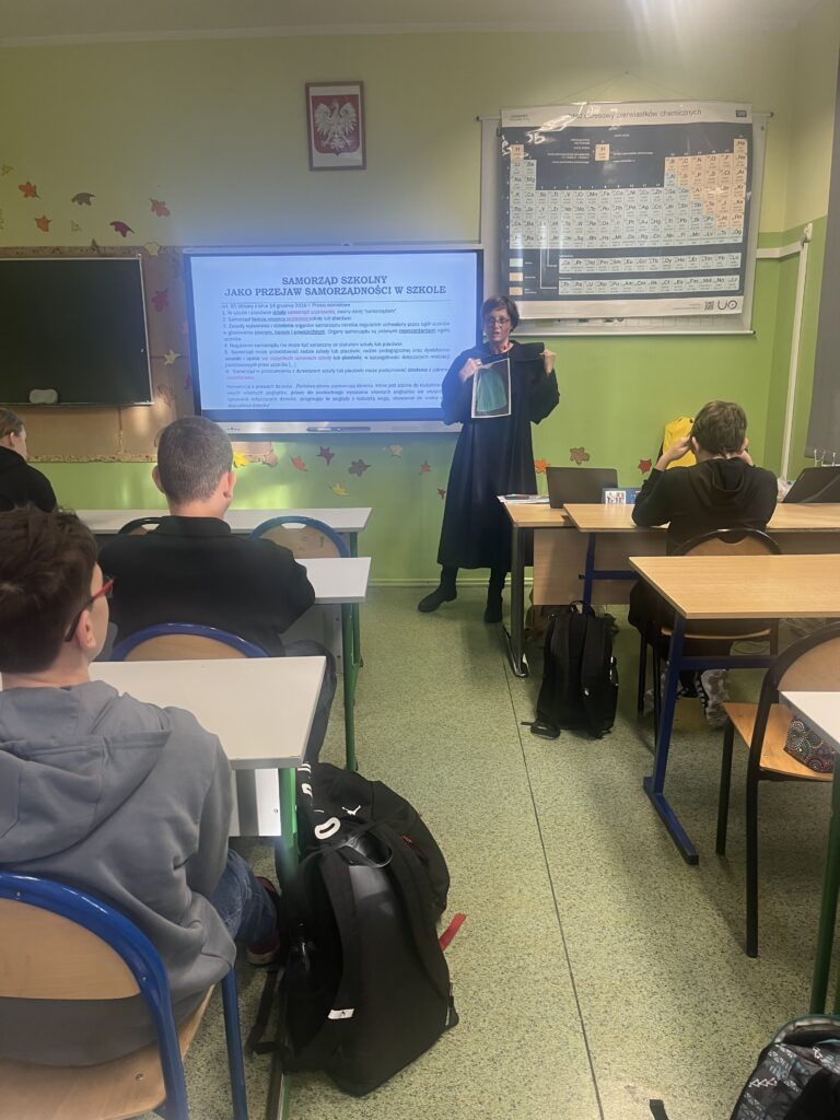 W minionym tygodniu ósmoklasiści uczestniczyli w zajęciach prawniczych prowadzonych przez mecenas Sylwię Kozłowską. Był to kolejny etap szkolnej edukacji prawnej — wcześniej uczniowie brali udział w spotkaniu z sędzią. Tym razem zajęcia dotyczyły funkcjonowania samorządu terytorialnego i szkolnego oraz specyfiki pracy w zawodzie prawnika.