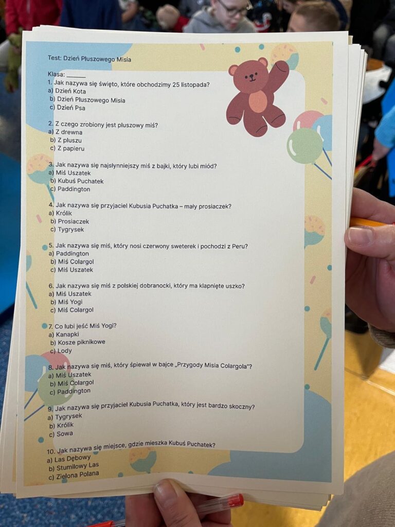25 listopada w naszej szkole uczniowie obchodzili jego święto. Każdy mógł przynieść ukochanego pluszaka do szkoły i razem z nim uczestniczyć w lekcjach, a także w specjalnie przygotowanym przez klasy 2a i 2c przedstawieniu pt: „Historia Pluszowego Misia”. Uczniowie mieli również możliwość wzięcia udział w quizie klasowym, po którym każdy otrzymał to, co małe misie lubią najbardziej czyli „małe co nieco”.