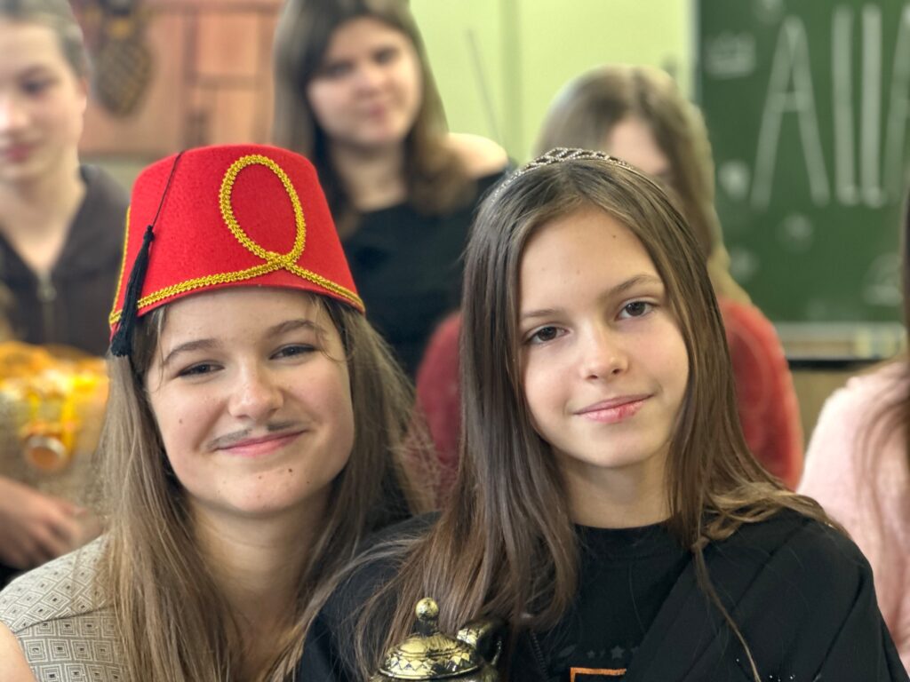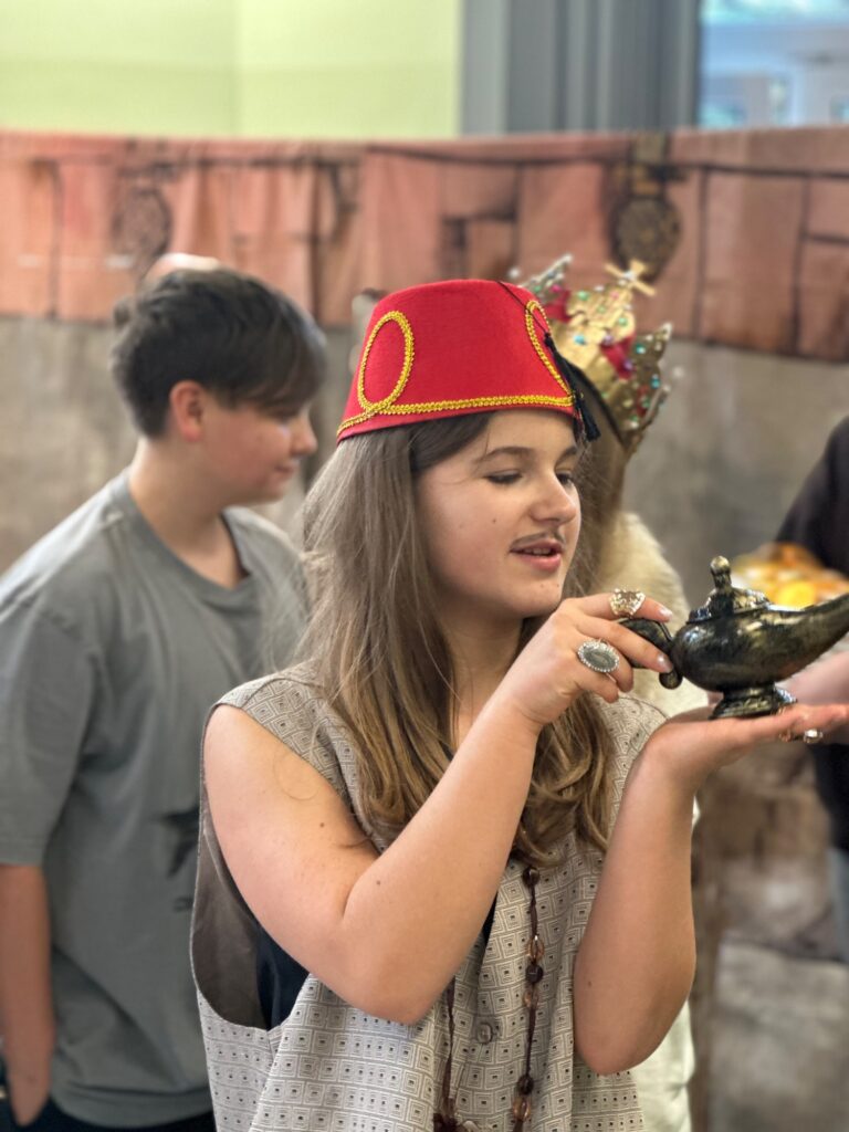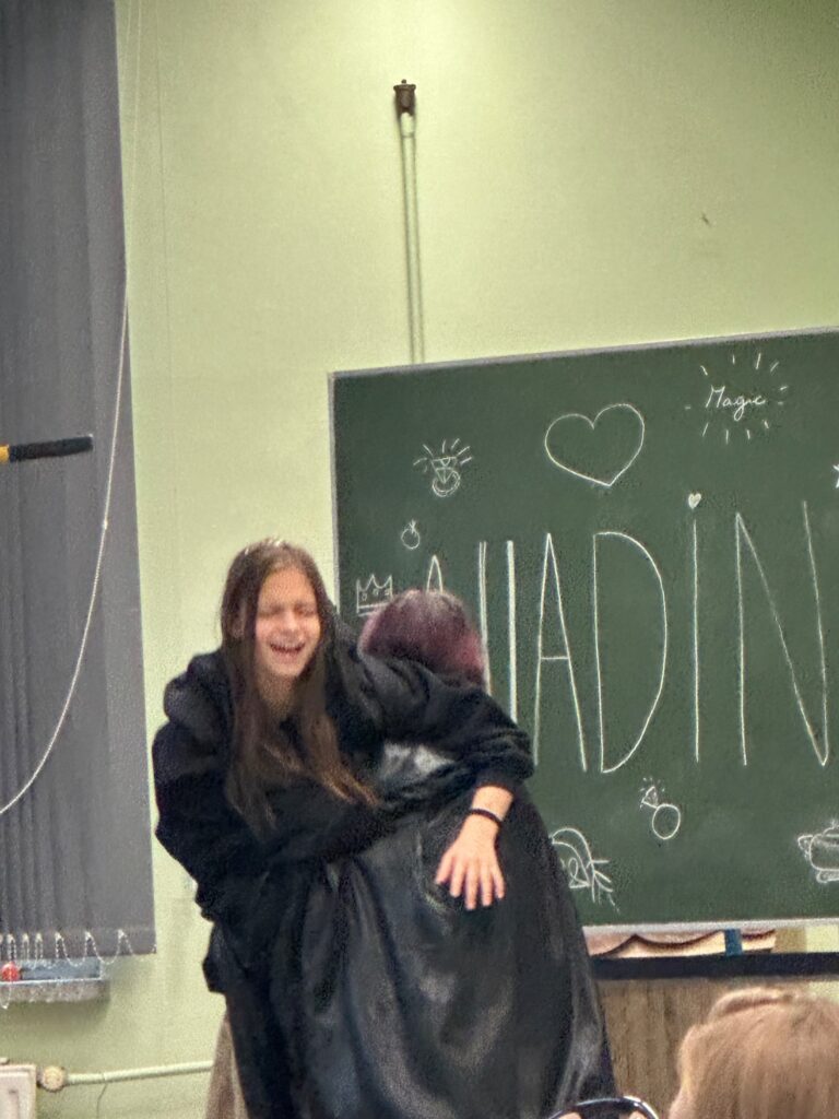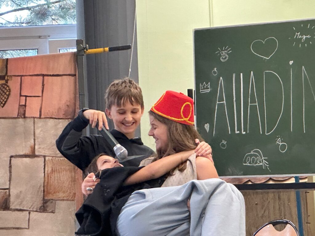 Gdy wszystkie trzy klasy zajęły miejsca na widowni rozpoczął się występ, który miał na celu zapoznanie klas młodszych z nowymi słowami w języku angielskim. Najpierw zza kurtyny wyszedł narrator i opowiedział, co zaprezentuje klasa szósta, następnie zaczęli pojawiać się aktorzy. Tematem przedstawienia była historia Alladyna. Tytułowy bohater i jego matka nie mieli wiele pieniędzy. Pewnego dnia obcy mężczyzna zawołał chłopca i kazał mu wejść do jaskini, by znaleźć magiczną lampę. Lecz mimo tego, że chłopak odnalazł to, co kazał mu obcy, to i tak został uwięziony. Szansa pojawiła się, gdy mężczyzna upuścił swój magiczny pierścień i Alladyn mógł wydostać się z niewoli z pomocą dżina zaklętego w pierścionku. W dalszej części historii chłopak przeżywał różne przygody z drugim dżinem i córką sułtana- Halimą.