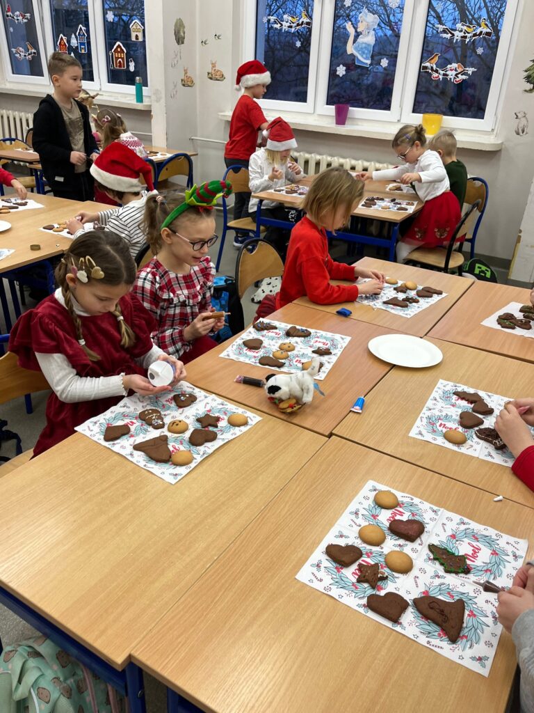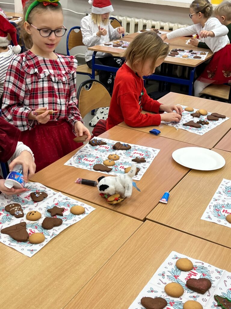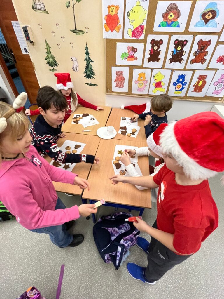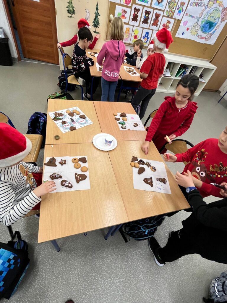 W piątek mikołajkowa atmosfera zawitała do klasy 1b. Uczniowie przyszli do szkoły ubrani mikołajkowo lub w świątecznych sweterkach. Każde z dzieci ozdobiło przygotowane przez rodziców pierniczki i ciasteczka kolorowym lukrem oraz posypką. Na zakończenie każdy uczeń dostał upominek od św. Mikołaja.