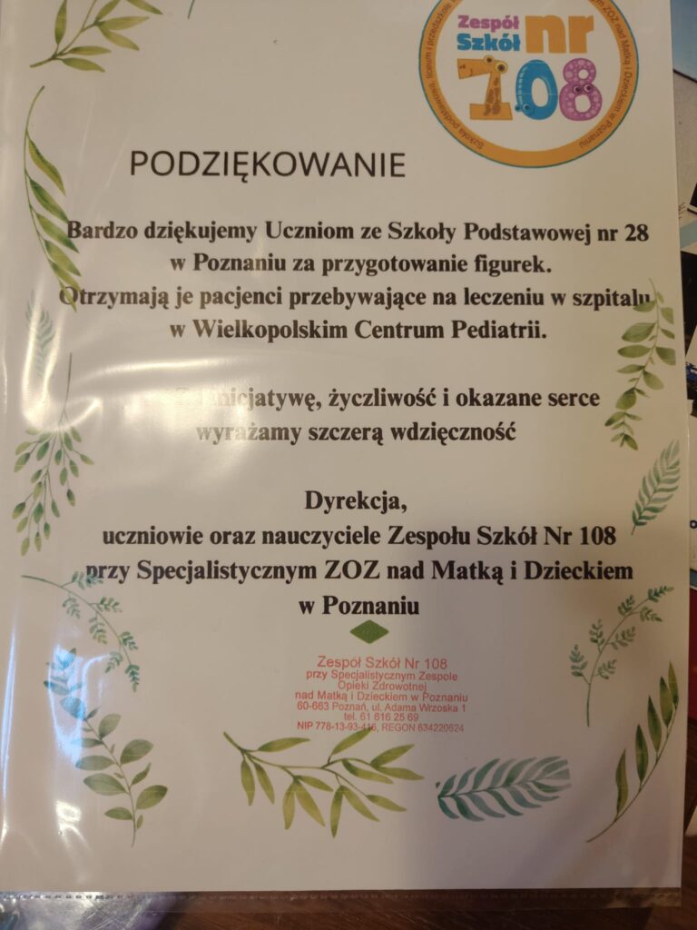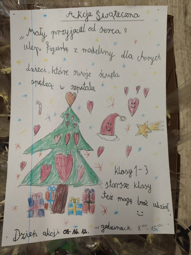Nasi młodsi uczniowie wzięli udział w świątecznej akcji „Przyjaciel od serca”, polegającej na lepieniu figurek z modeliny dla dzieci przebywających na oddziałach Wielkopolskiego Centrum Pediatrii przy ul. Wrzoska w Poznaniu.