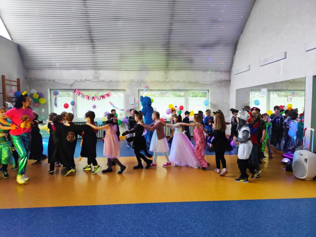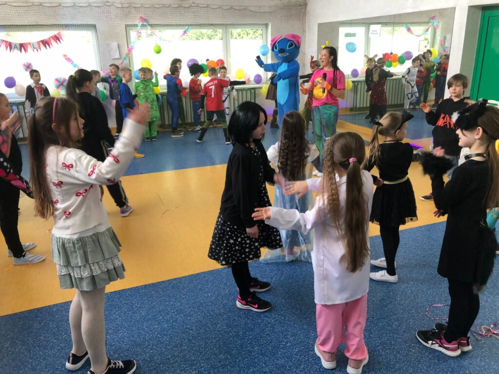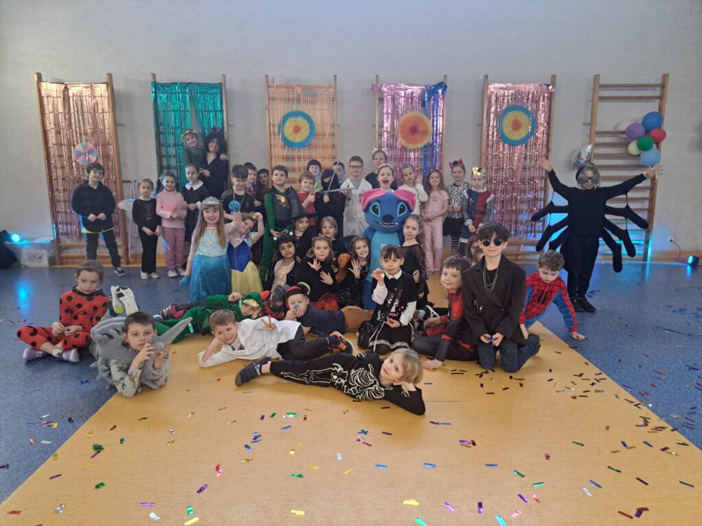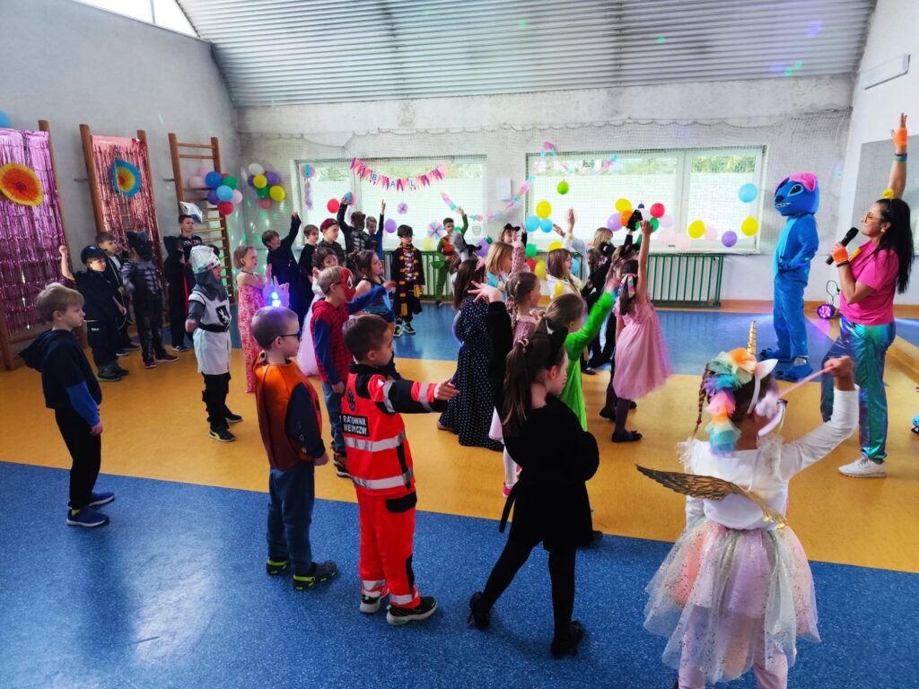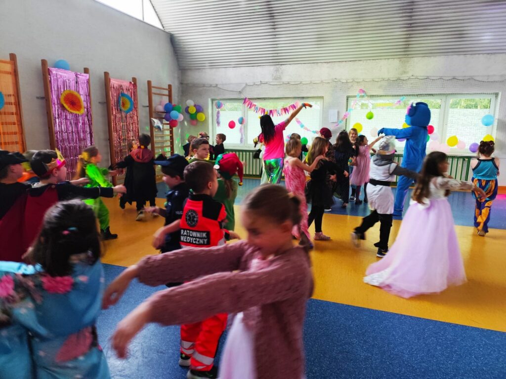 Uczestnicy przebrali się za postacie z bajek i baśni, superbohaterów oraz przedstawicieli różnych zawodów. Wystrój sali tworzył radosną atmosferę i zachęcał do wspólnej zabawy. W rytm muzyki wszyscy chętnie tańczyli i integrowali się, a proponowane atrakcje oraz konkursy cieszyły się dużym zainteresowaniem.